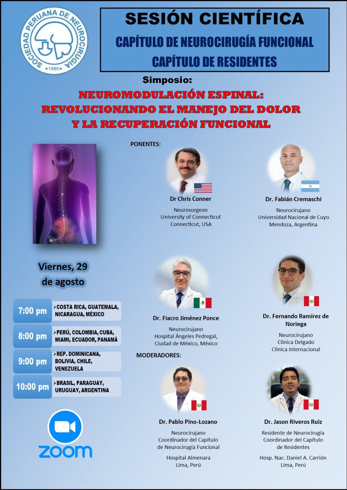 Muy agradecido al Dr. Pablo Pino-Lozano y a la Sociedad Peruana de Neurocirugía por invitarme para hablar, junto a prestigiosos colegas internacionales, sobre el tratamiento quirúrgico funcional (neuromodulación) del dolor de columna refractario y otras aplicaciones de la estimulación medular (SCS).